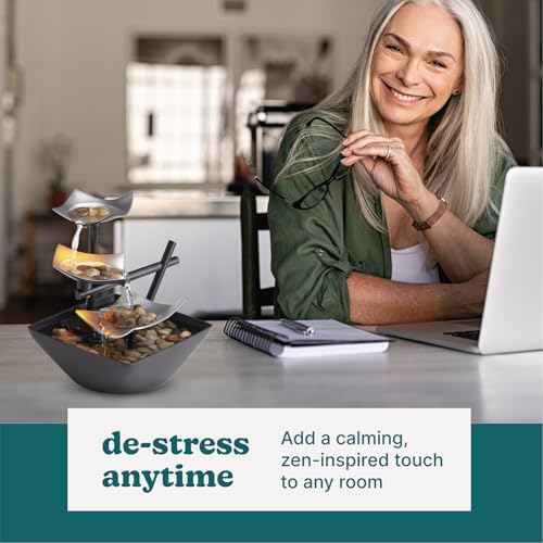 - Decorative Tabletop Fountain: Showcase EnviraScape’s Silver Springs Relaxation Fountain on Display to bring a calming, Zen feel to any room; It is just the right size to add a Decorative accent to any Tabletop, bathroom sink, and vanity or Office desk; It Features a 3 tiered Waterfall, natural stones, and a Large basin; The tiers create several streams of Water creating a Gentle Soothing sound of Water; The Water flow replicates the sights and Sounds of a tranquil spring